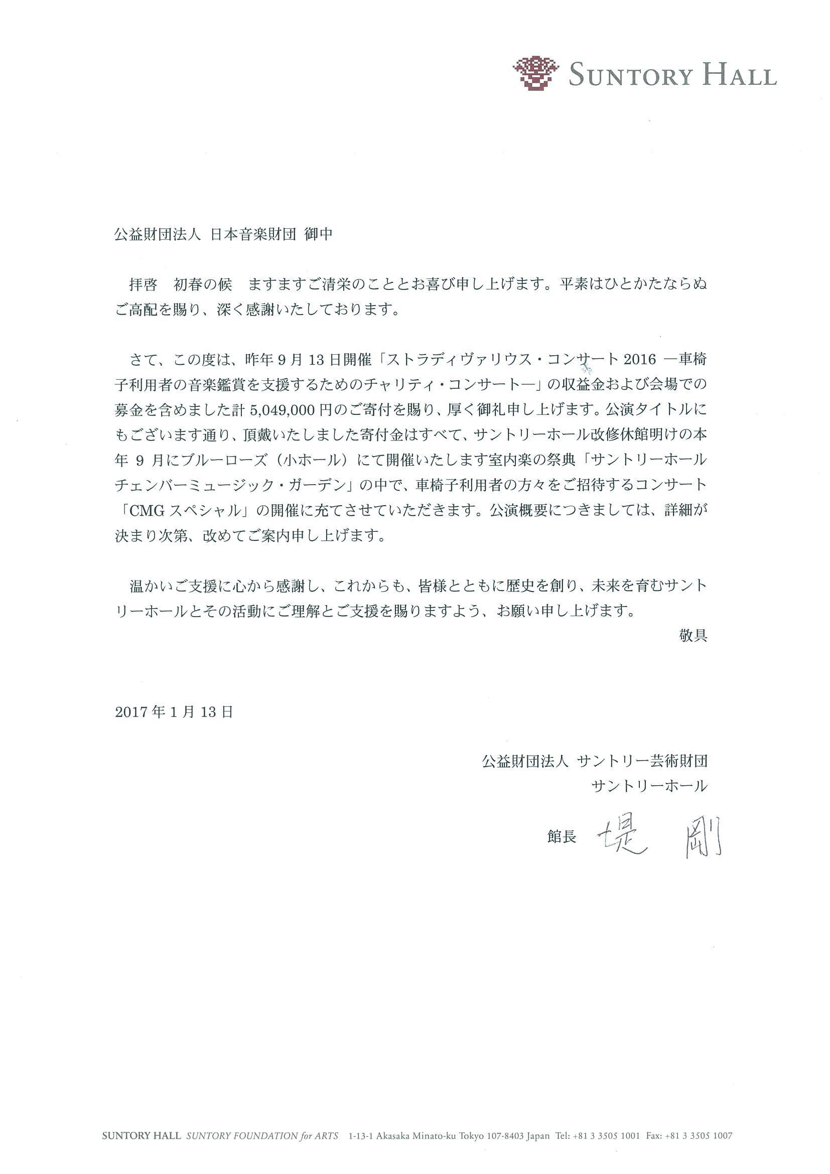 2016年9月13日にサントリーホール(東京港区)で開催いたしました「ストラディヴァリウス・コンサート 2016」のチケット売上と会場募金より、総額5,049,000円を、公益財団法人サントリー芸術財団サントリーホールへ寄付いたしました。