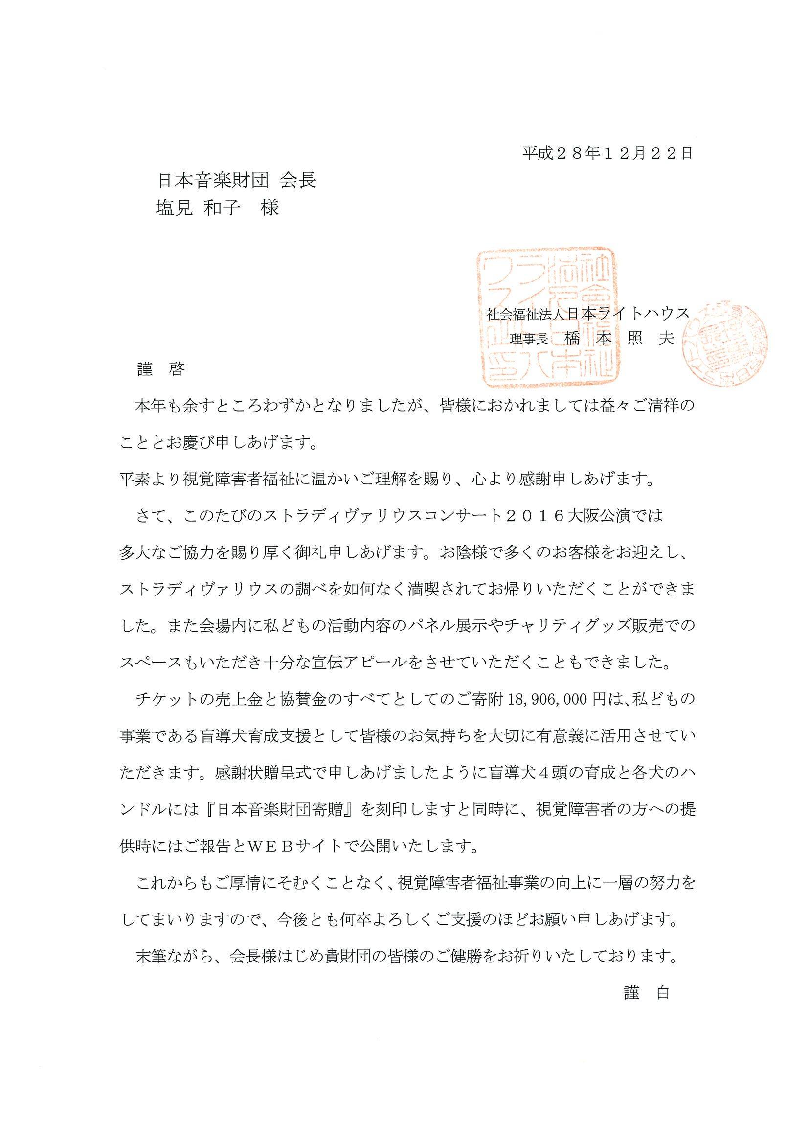 Nippon Music Foundation donated to the Nippon Lighthouse 18,906,000 yen, the total proceeds from ticket sales and generous supports from local organizations. This donation will be used to raise guide dogs. A brief introduction of Nippon Lighthouse’s “Guide Dog Training” is available on page 18-20 in the concert program below.
